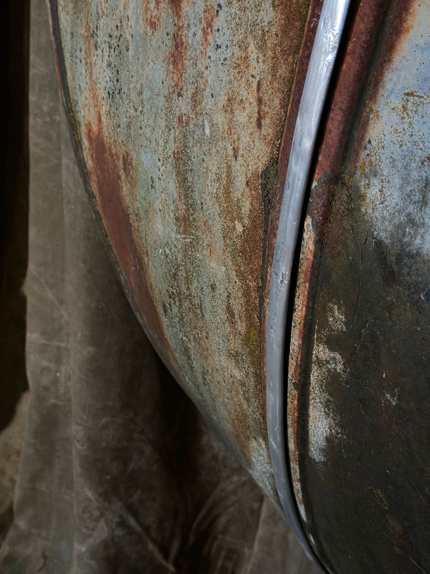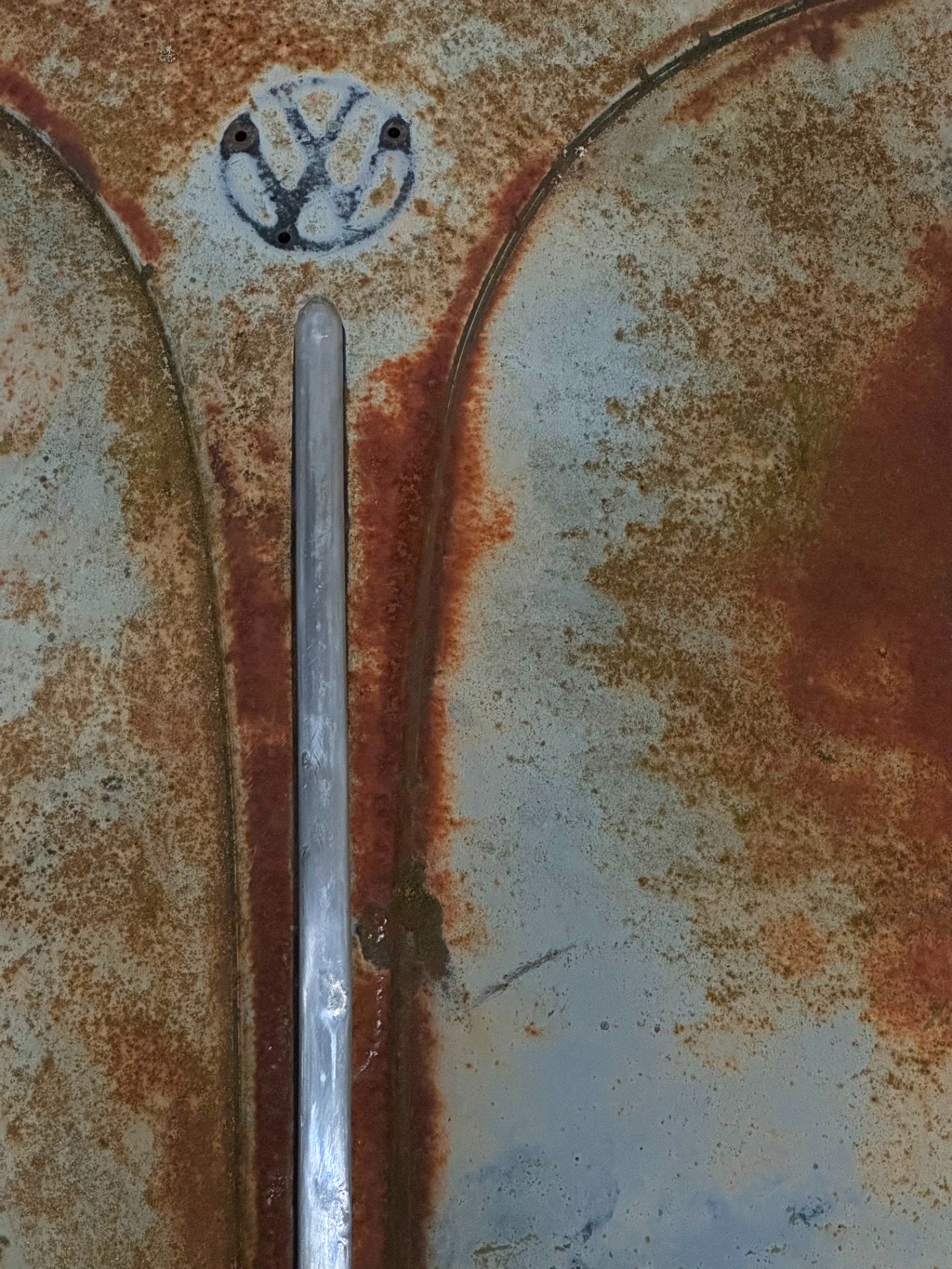 Once deep black, now worn by time, this original 1960s VW Beetle bonnet shows every mark of its long life — the rust blooms, the thin paint, the soft fading where light and weather left their trace. Its surface tells a quiet story of age and endurance.