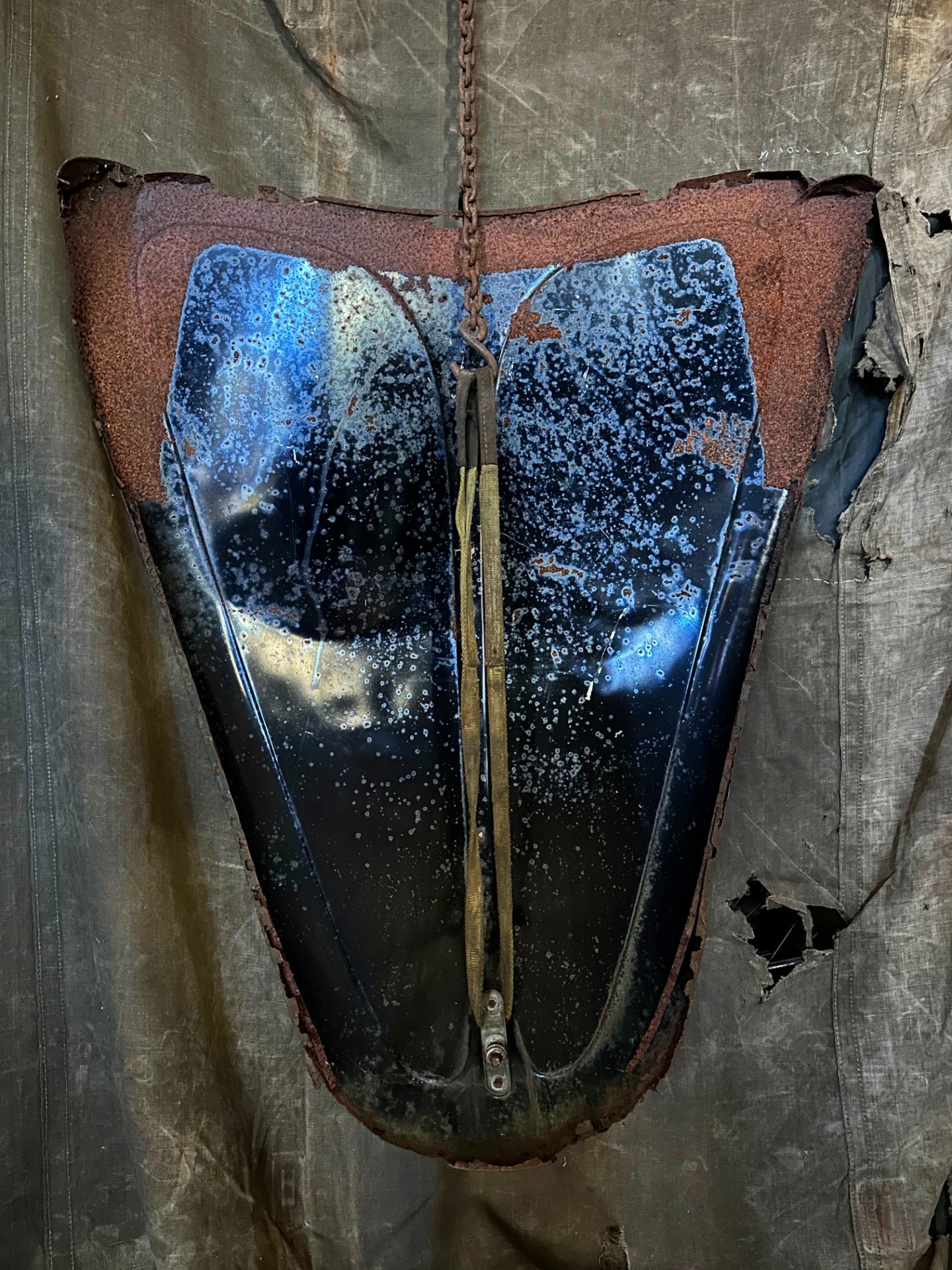 Mounted on a wall or backlit, the metal takes on a haunting glow — part sculpture, part memory. A ghostly presence from the open road, preserved in steel and patina.