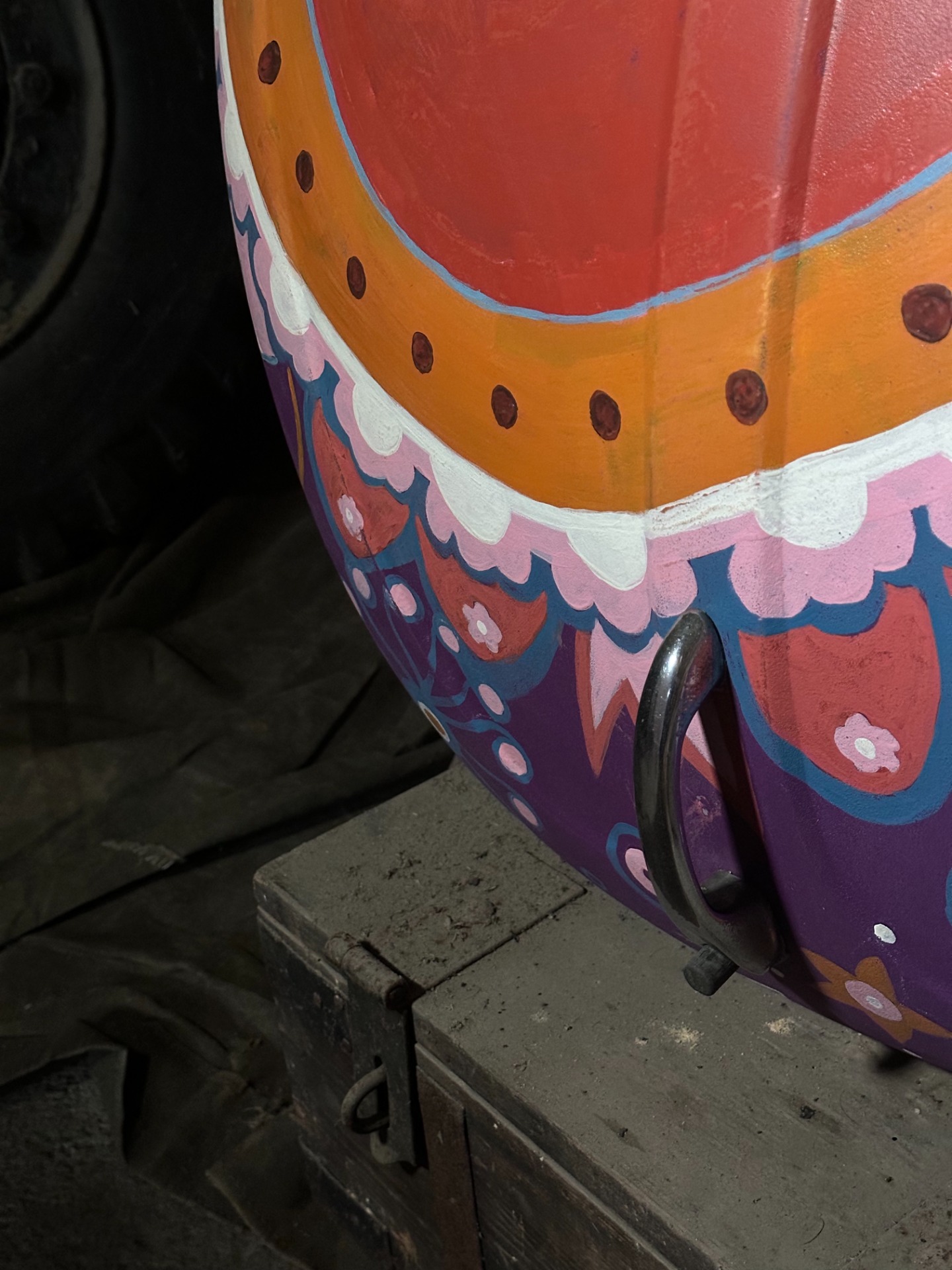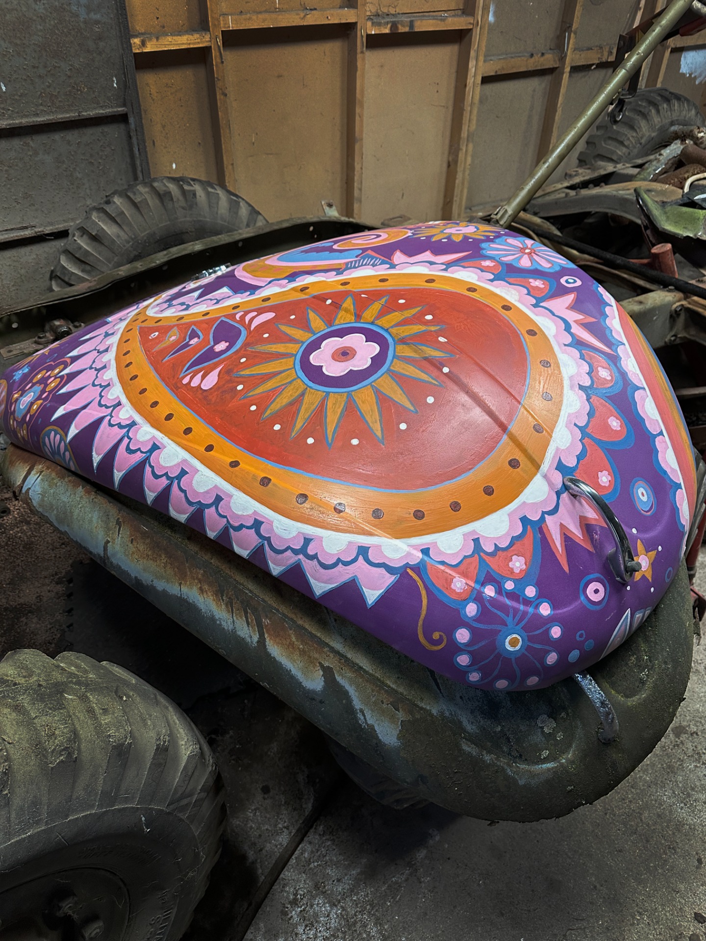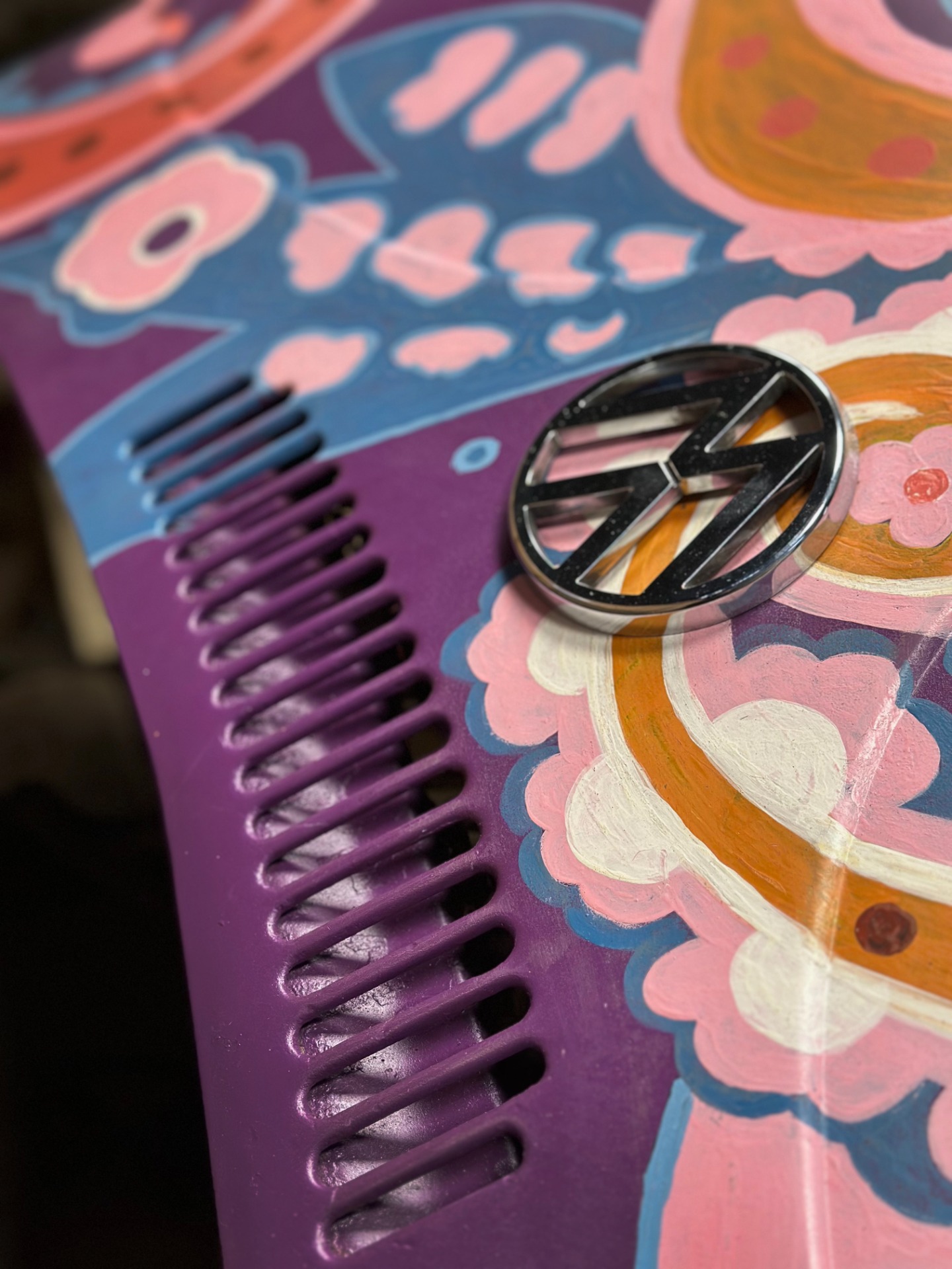 Once the front end of a classic Beetle, now a vibrant piece of wall art inspired by the psychedelic spirit of the 1960s. Over 500 hours of work went into creating this one-of-a-kind masterpiece — from cleaning and repairing the metalwork to carefully prepping it for paint, sketching the full design on tracing paper, transferring it to the bonnet, and finally painting by hand in nine bold colours.